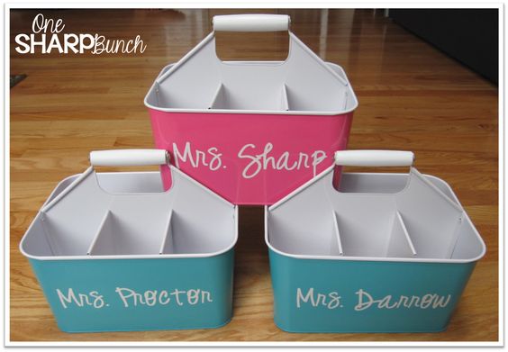 Customize some bins to make sure supplies stay where they’re supposed to and your stuff doesn’t get mixed into the classroom stash. Another idea from One Sharp Bunch!