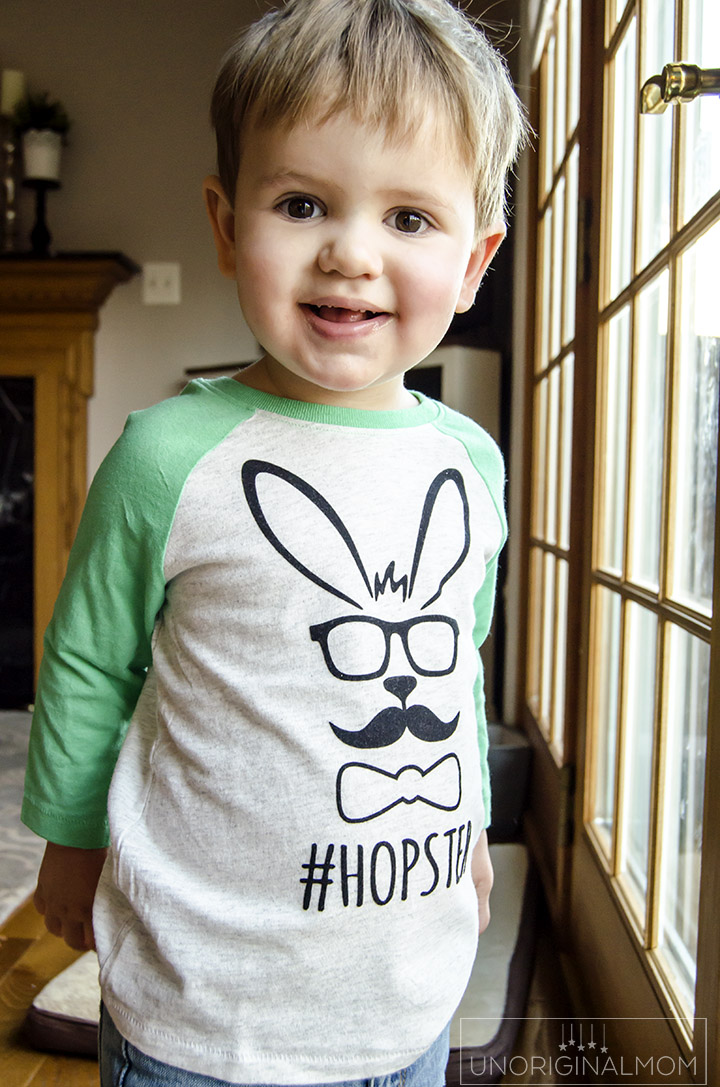 I had seen a few variations of these “hopster” Easter shirts while browsing Pinterest and I thought they were so clever and cute! (Get it…it’s like #HIPster, but since he’s a bunny with hipster glasses and a hipster mustache, it’s #HOPster…heh, heh.) So, I decided to make my own version of the design and slap it on a shirt for my 2 year old. It took me less than 30 minutes!