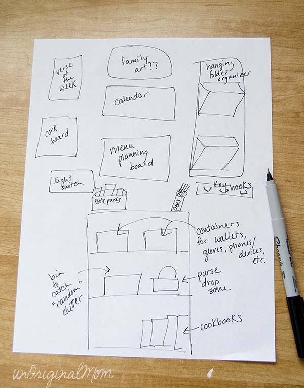5. Design it. Now that you’ve through through what you’d like to include, it’s time to figure out a design! First of all, decide how much flat space and how much wall space you will be devoting to your command center. We bought an inexpensive put-together-yourself 3 shelf bookshelf to be part of our space – it’s not very deep so it doesn’t get in the way, but the top is great to have a flat space to write quick notes and lists. I added a few bins to the shelves to help catch clutter. Next, you need to determine a budget – how much are you willing to spend on this command center? (Remember that you can start with the bare bones and add to it later!) After that comes the fun part – grab a cup of your favorite hot beverage and spend some quality time on Pinterest browsing Command Centers. What do see that you absolutely love? What seems like it would be functional for your family, in your space, and with your budget? Think through your plan. Are you creating a separate space for each member of your family? Or grouping by category? How will you control clutter on flat spaces? Consider height – what do the smaller members of your family need to be able to reach? Don’t forget about the list you made in #1 – make sure you create a place for everything! Now, sketch out a “blueprint” of your command center. You’ll probably go through several drafts until you settle on something that will work.